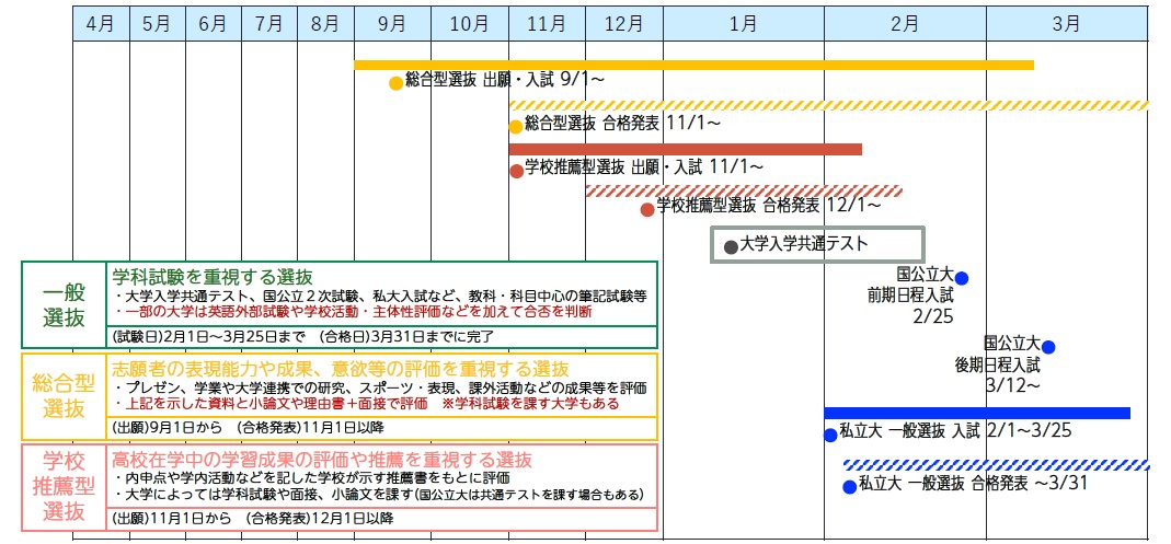 注意したいのは、学校推薦型選抜の指定校制では、合格したら必ず入学することを条件に出願する「専願」が前提となること。公募制の場合も専願が多いですが、私立大では併願が認められているケースもあります。一方、総合型選抜は多くが併願可能です。